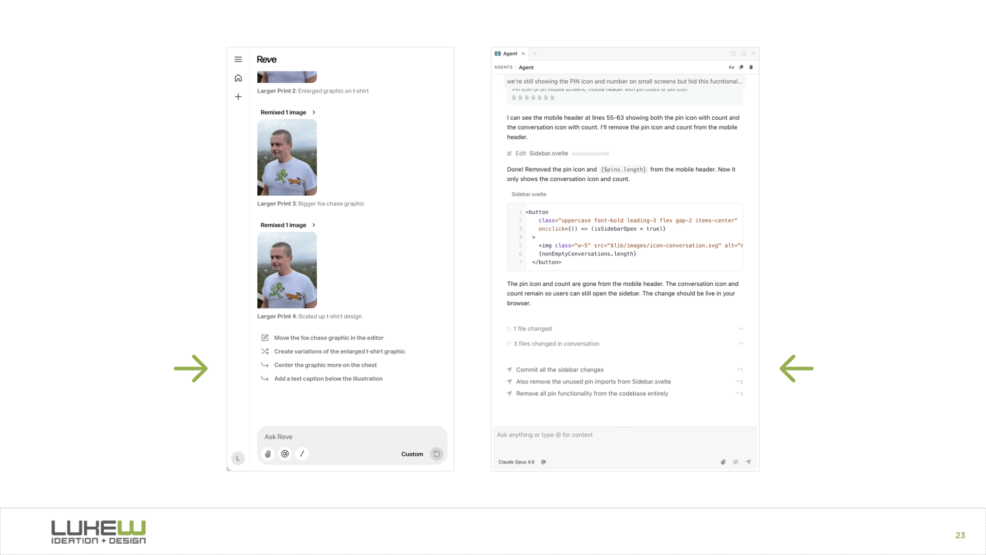 For context awareness, I showed how products like Reve let you spatially tell the model what to pay attention to. You can highlight an object in an image, drag in reference art, move elements around, and then apply all those changes. You're being very explicit through the interface about what the model should focus on. I also showed context panels where you can attach files, select text, or point the model at specific folders.