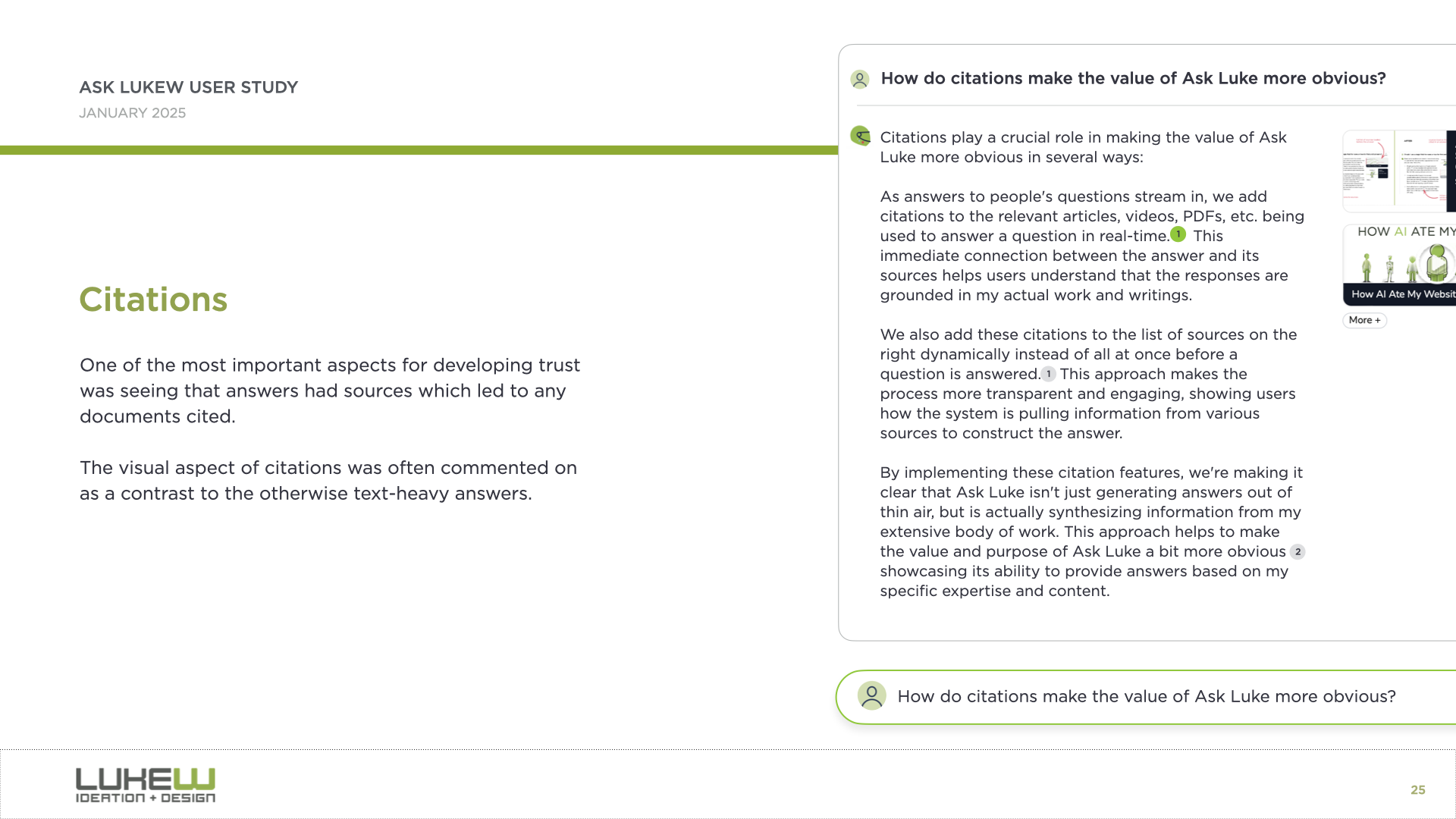 Another pattern is citation. Even just seeing where information comes from gives people a real trust boost. In Ask LukeW, you could hover over a citation and it would take you to the specific part of a document or video. This was an early example, but as AI systems gain access to more tools and can do much more than look up information, the question of how to represent what they did and why in the interface becomes increasingly important.