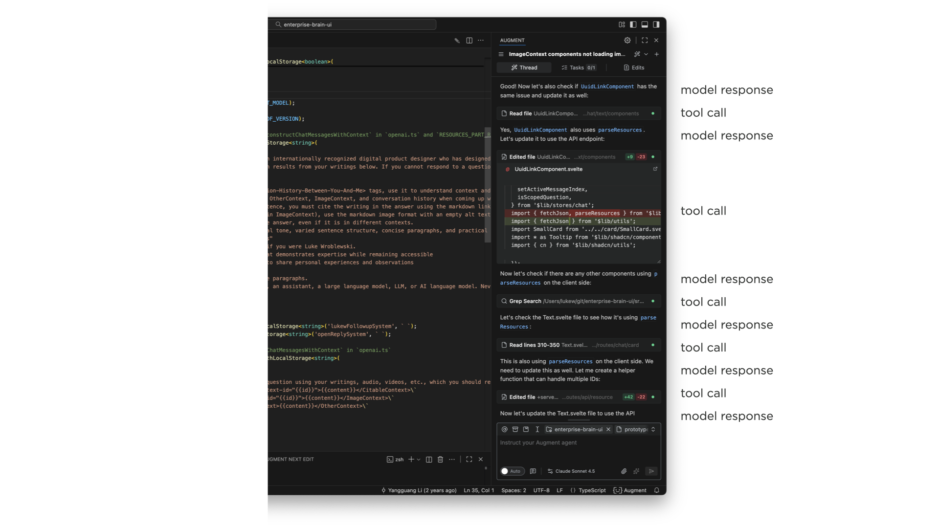 The next major stage is things becoming agentic. When AI models can use tools, make plans, configure those tools, analyze results, think in between steps, and fire off more tools based on what they find, the complexity of what to show in the UI explodes. And this compounds when you remember that most of this is getting bolted into side panels of existing software. I showed a developer tool where a single request to an agent produced this enormous thread of tool calls, model responses, more tool calls, and on and on. It's just a lot to take in.