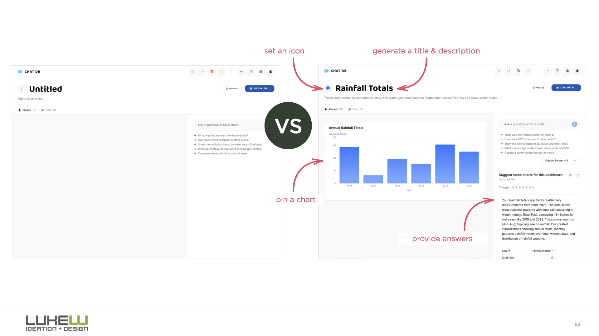 And then there's onboarding. Designers are familiar with the empty screen problem, and the usual advice is to throw tooltips or tutorials at it. But it turns out we can have the AI model handle all of this instead. In ChatDB, when you drag a spreadsheet onto the page, the system picks a color, picks an icon, names the dashboard, starts running analysis, and generates charts for you. You learn what it does by watching it do things, rather than trying to figure out what you can tell it to do.