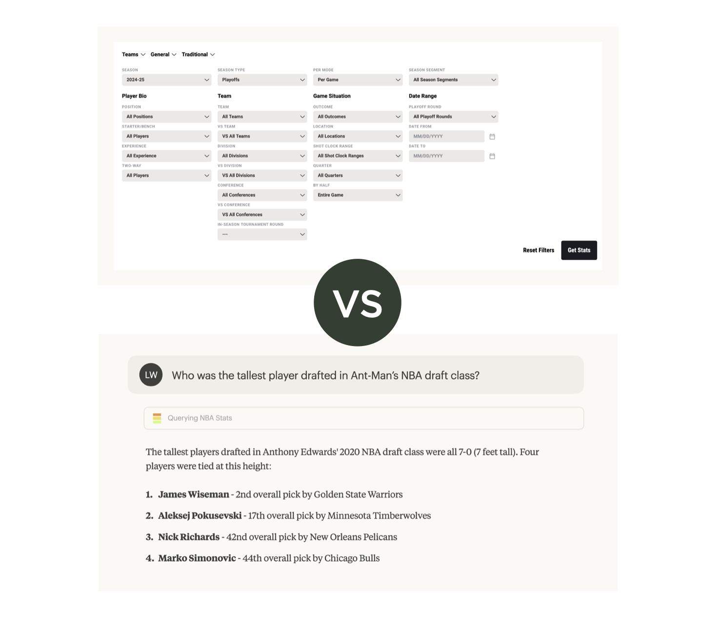 In the past a developer would need to write code to render the user interface for an application front-end to this database. That code would determine what kind of questions people could get answers to. Usually this meant a bunch of UI input elements to search and filter games by date, team, player, etc. The NBA's stats page (below) is a great example of this kind of interface.